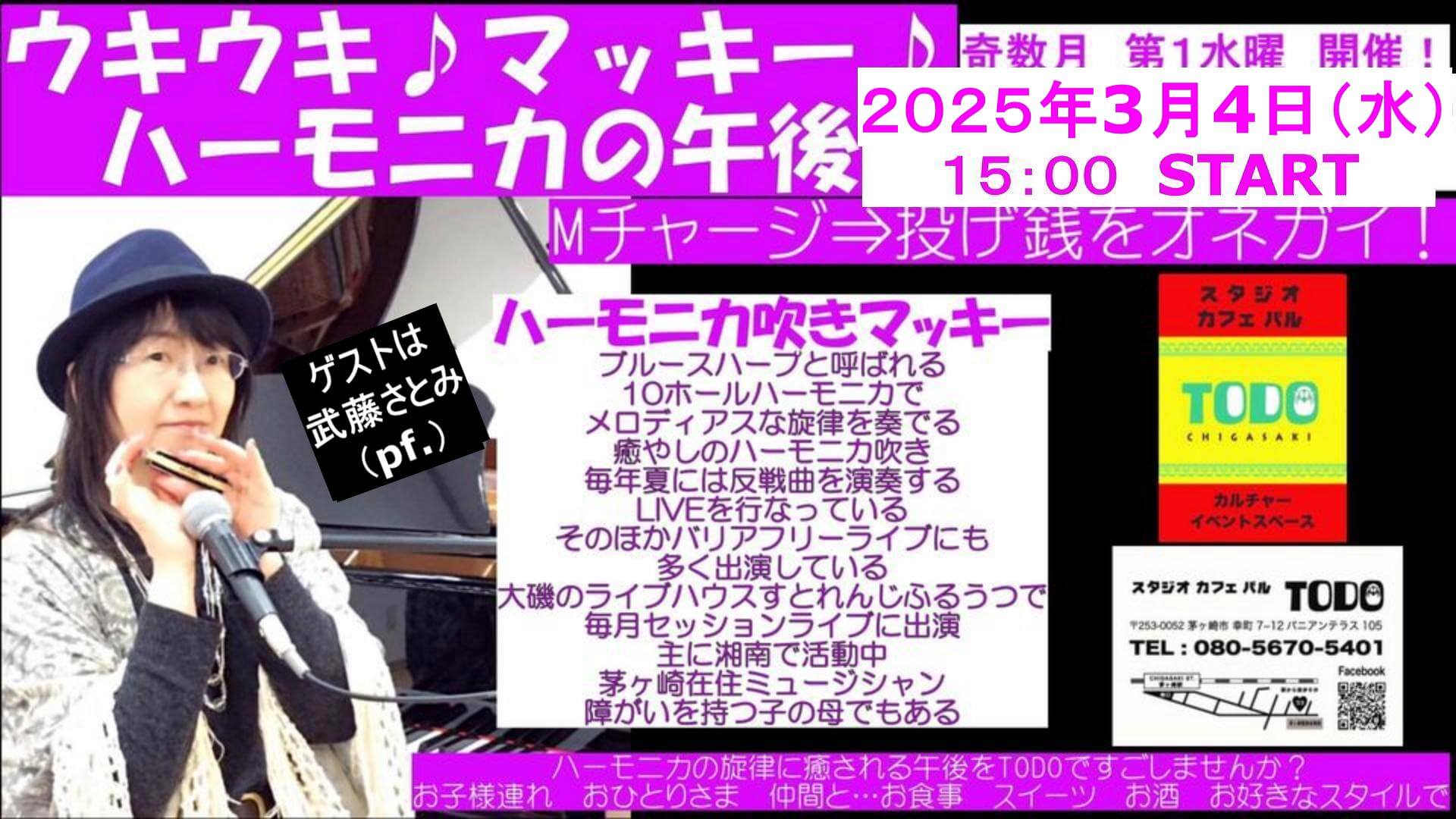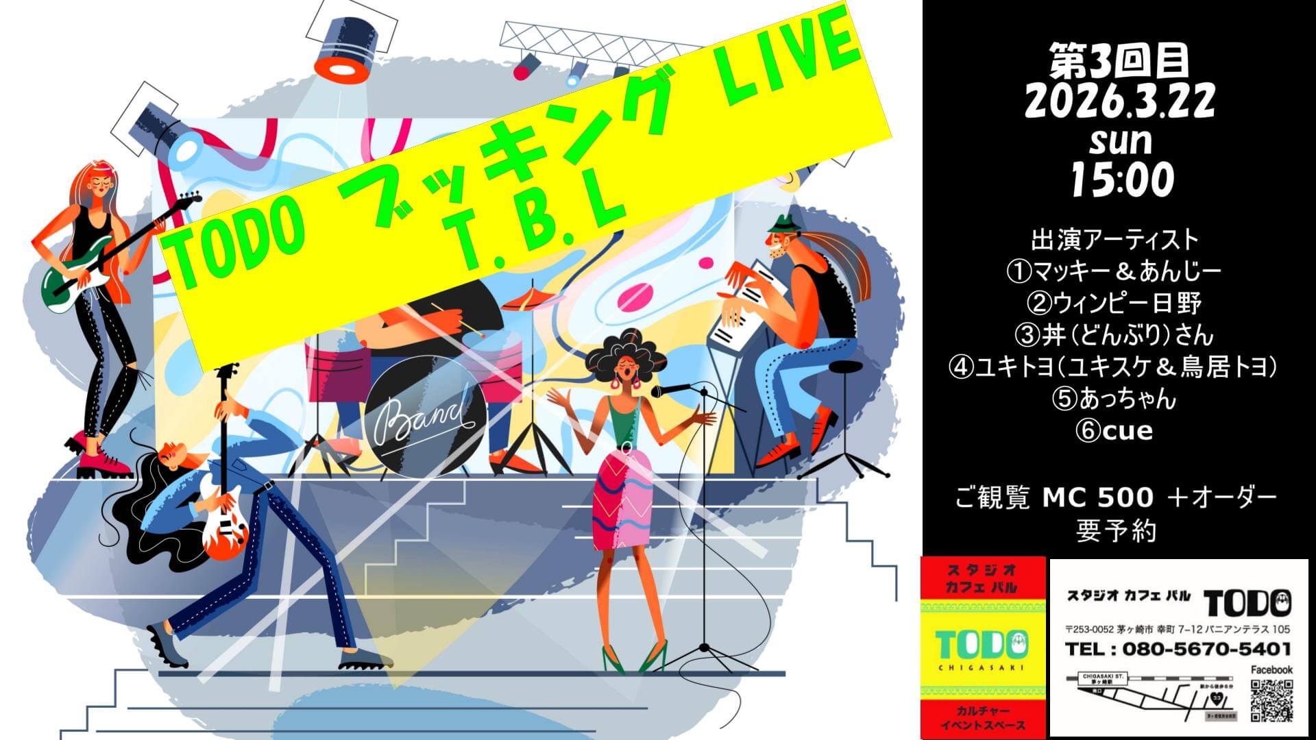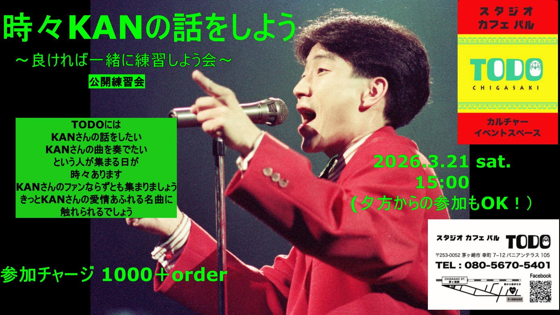 茅ヶ崎駅南口徒歩6分で、茅ケ崎徳洲会病院の正面バニアンテラス1Fにある、ライブ、カラオケ(何曲歌っても500円)、セミナー等もできるイベントスタジオです。